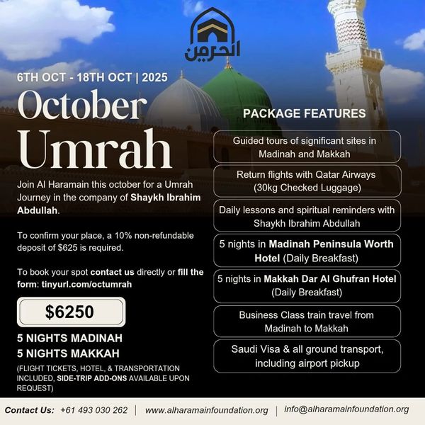 Join us for a spiritually transformative Umrah journey from 6th to 18th October, accompanied by Shaykh Ibrahim Abdullah as your guide and teacher. This blessed journey includes 5 nights in Madinah at the Al Aqeeq Hotel with daily buffet breakfast, and 5 nights in Makkah at Dar Al Ghufran Hotel, also with daily breakfast—both just a short walk from the Haramain.